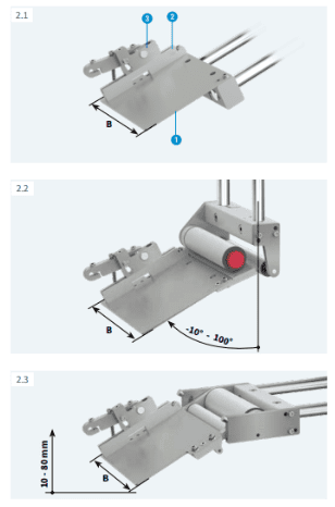 S přihlédnutím k použití aplikátoru se předpokládá použití pouze tzv. ,,demand modulů“. Jedná se o odlepovací hrany s různou délkou, šířkou a funkcí. Šířky těchto modulů je možné volit ve třech variantách, a to od 62 mm přes 124 mm až po 186 mm v případě nejširších etiket. Na obrázku 2.1 níže je vidět nejjednodušší varianta přímého odlepovacího modulu, který neumožňuje další donastavení úhlu etiketace. Obrázek 2.2 znázorňuje již sofistikovanější variantu, která umožňuje měnit úhel odlepování etikety vůči produktu a na obrázku 2.3 je vidět nejuniverzálnější verze odlepovací hrany, která se dokáže přizpůsobit rozdílné výšce produktů v rozmezí 10 – 80 mm. ,,Zažehlení“ etikety na produktu je možno provádět štětinami nebo pěnovým válečkem dle potřeb dané aplikace.